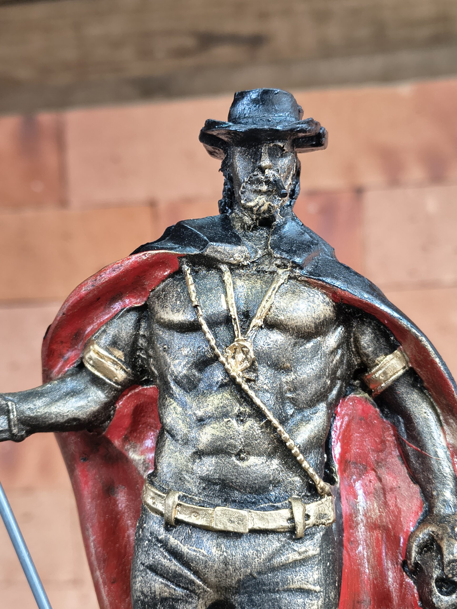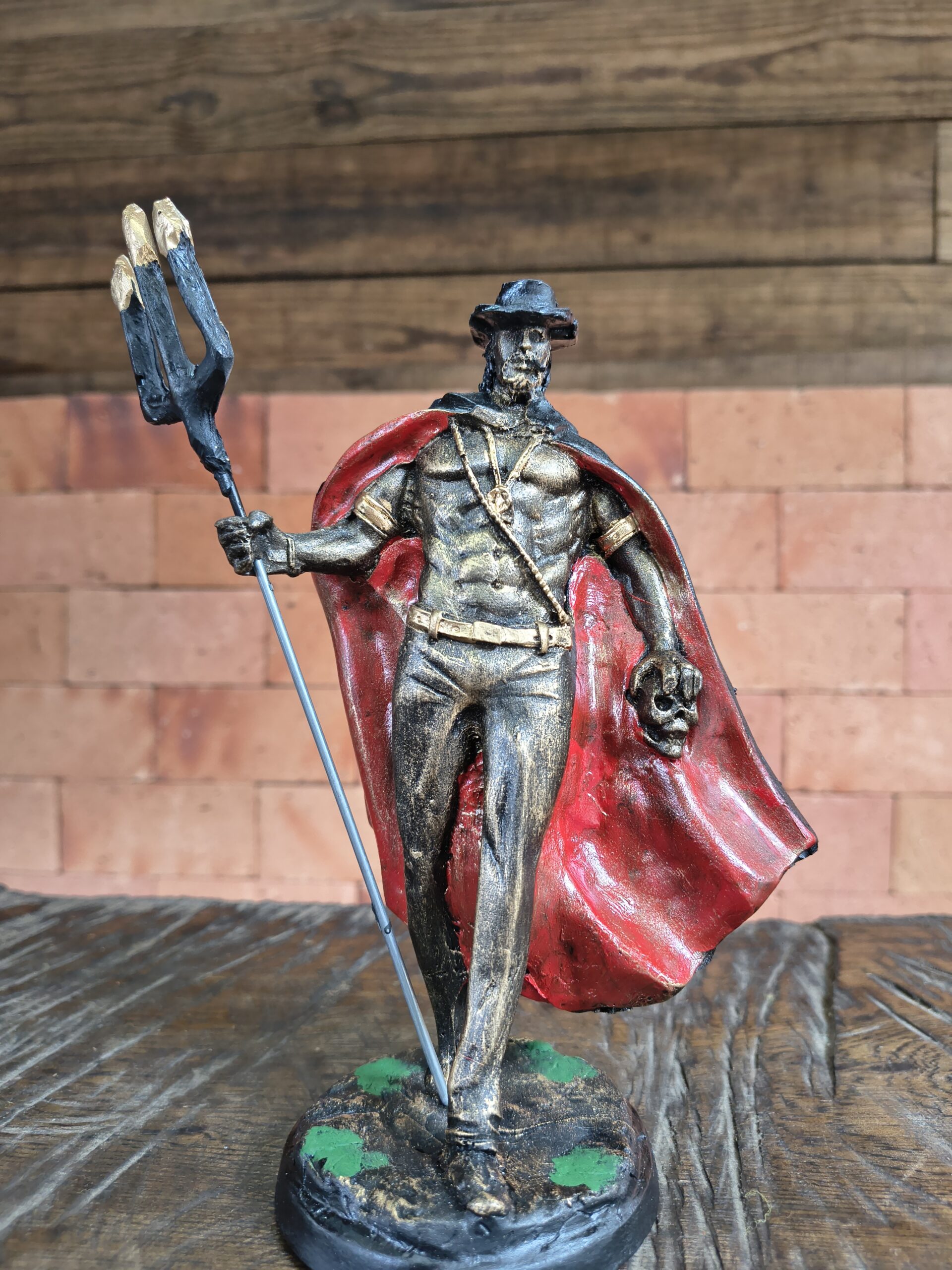 Com detalhes marcantes em vermelho, dourado e preto, a escultura representa Exu em sua postura imponente: capa esvoaçante, tridente em mãos e o domínio simbólico entre o mundo espiritual e o material. Cada traço reforça a energia de movimento, coragem e transformação que este Guardião carrega.