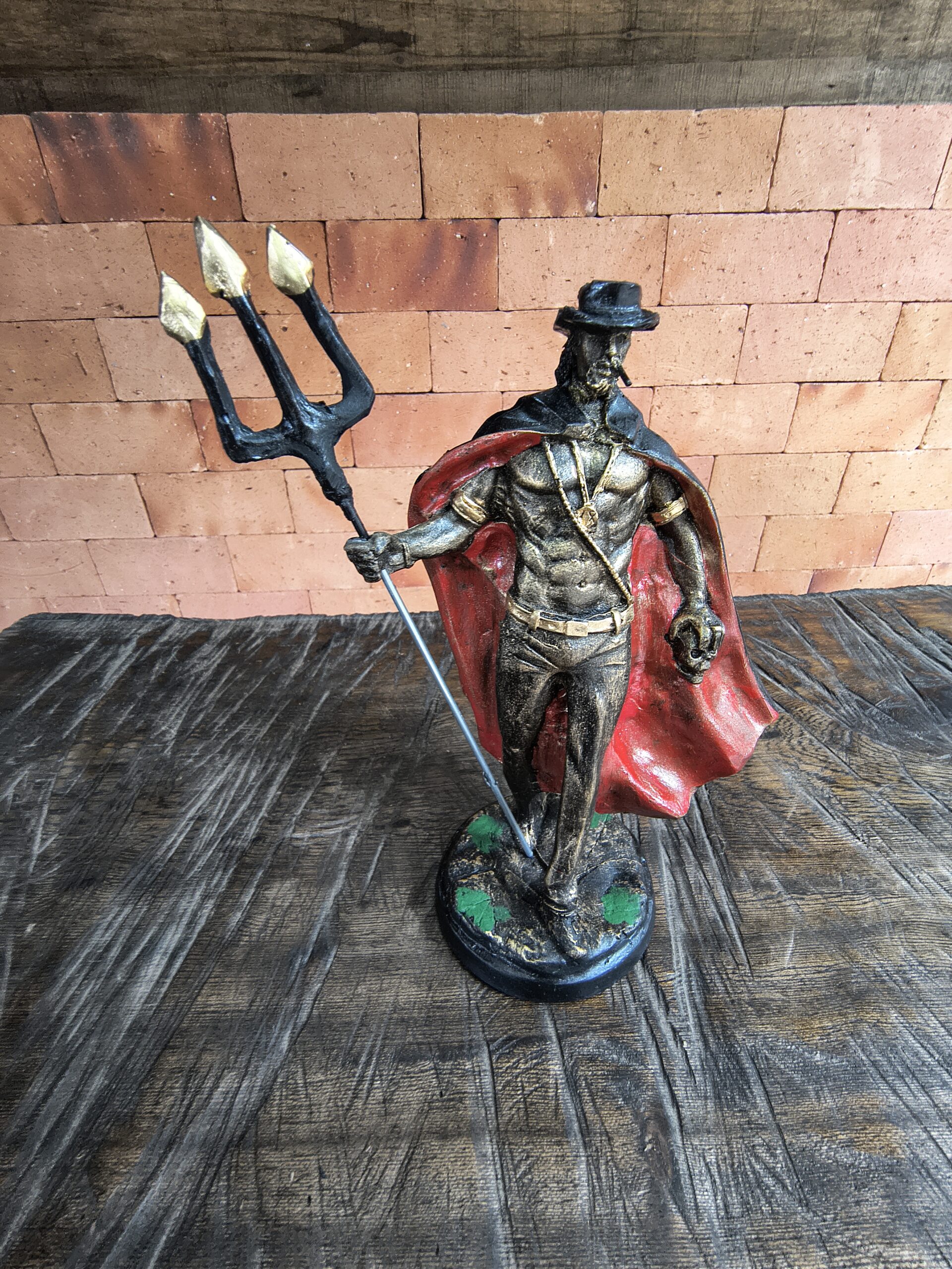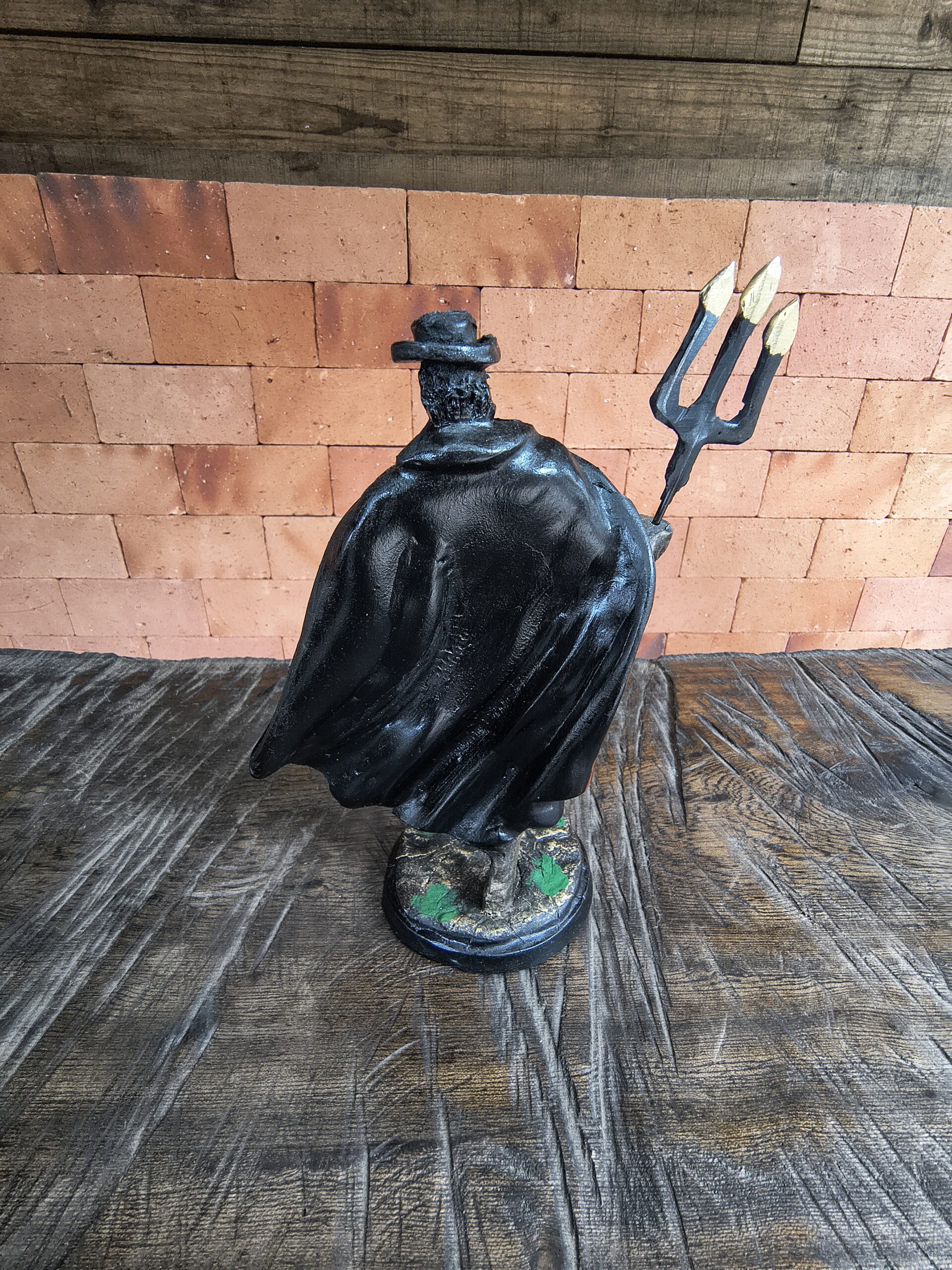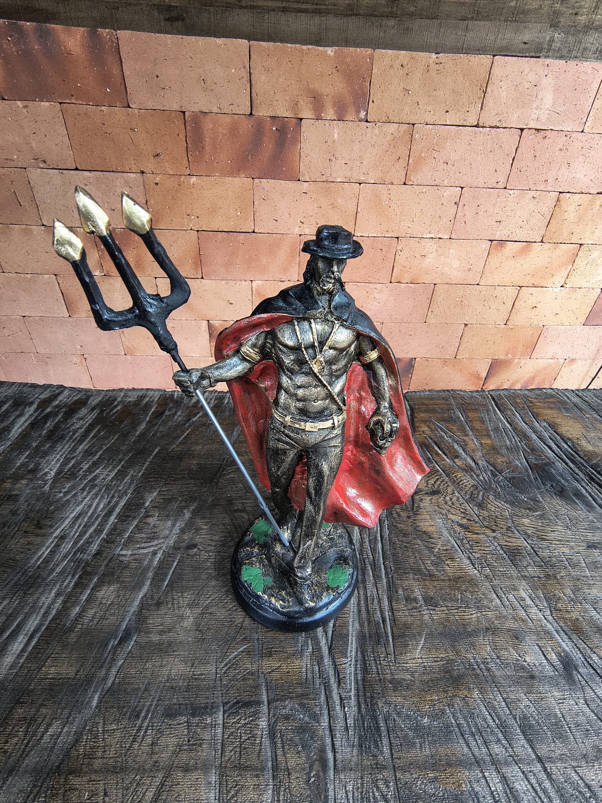 Esta belíssima imagem de Exu, com aproximadamente 23 cm de altura e cerca de 580 g, é uma peça feita para quem busca força, proteção, firmeza e abertura de caminhos dentro da Umbanda e da espiritualidade ancestral.