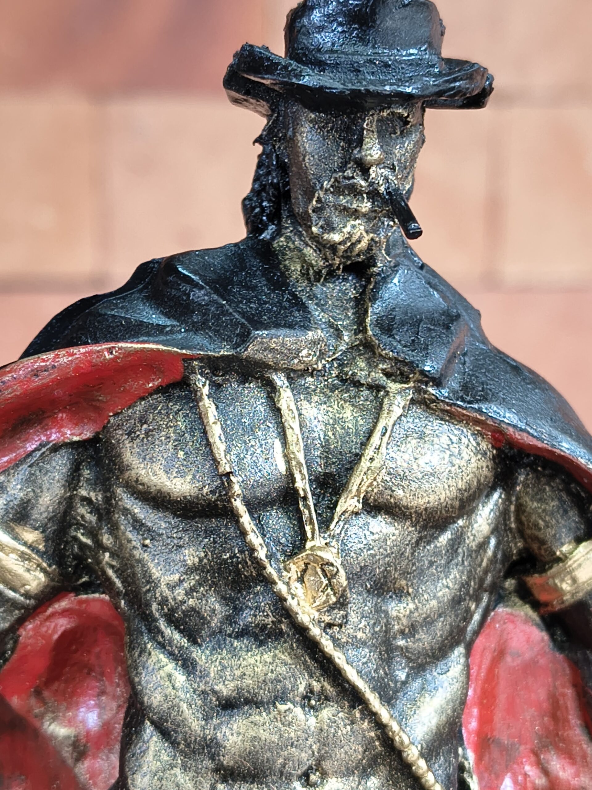 Acabamento: pintura artística com detalhes dourados e capa vermelha vibrante