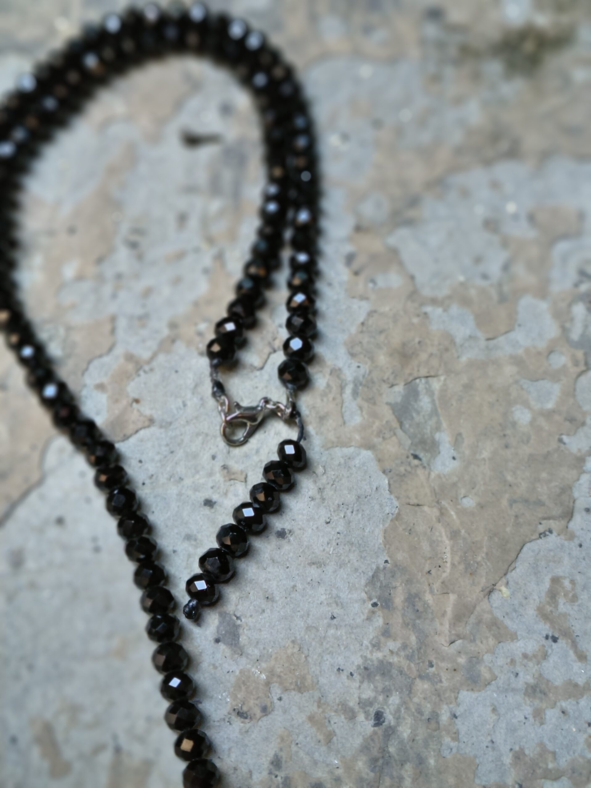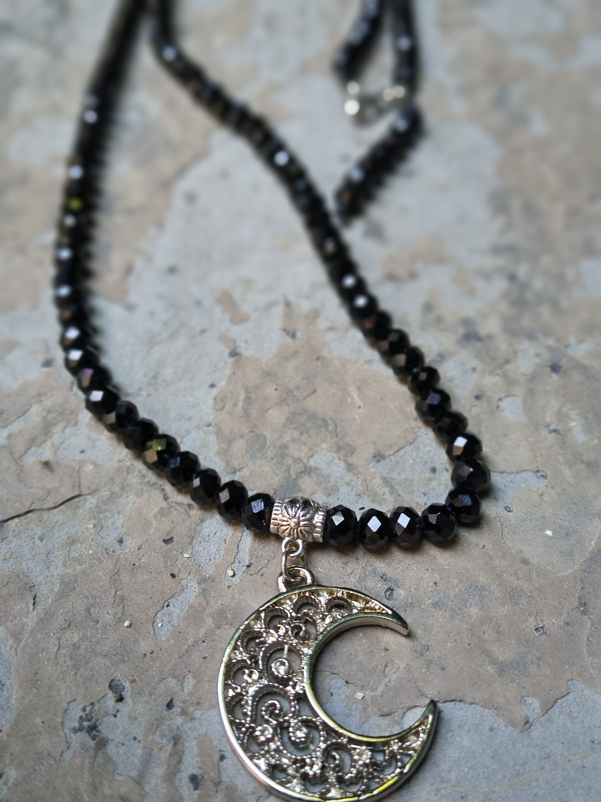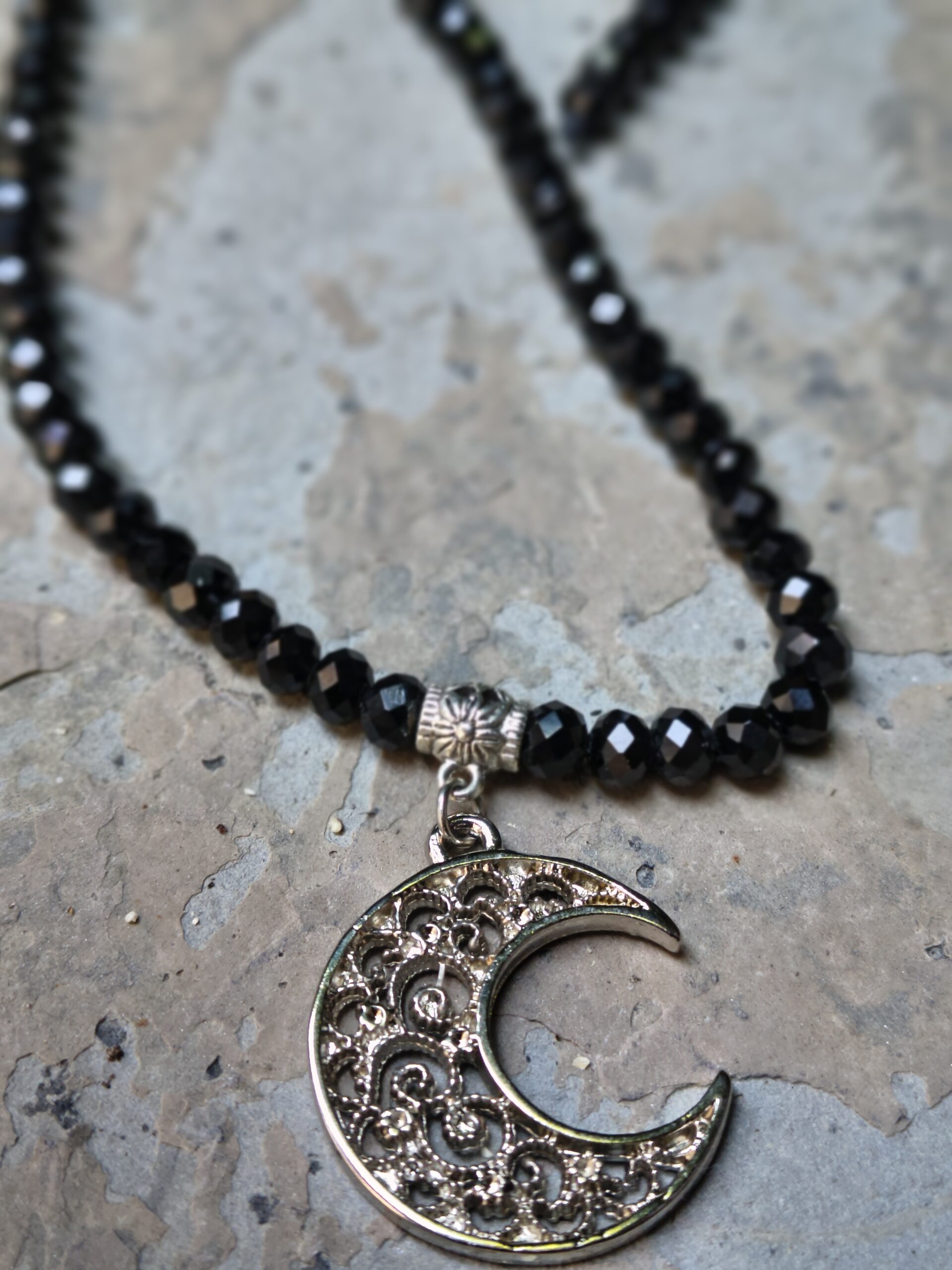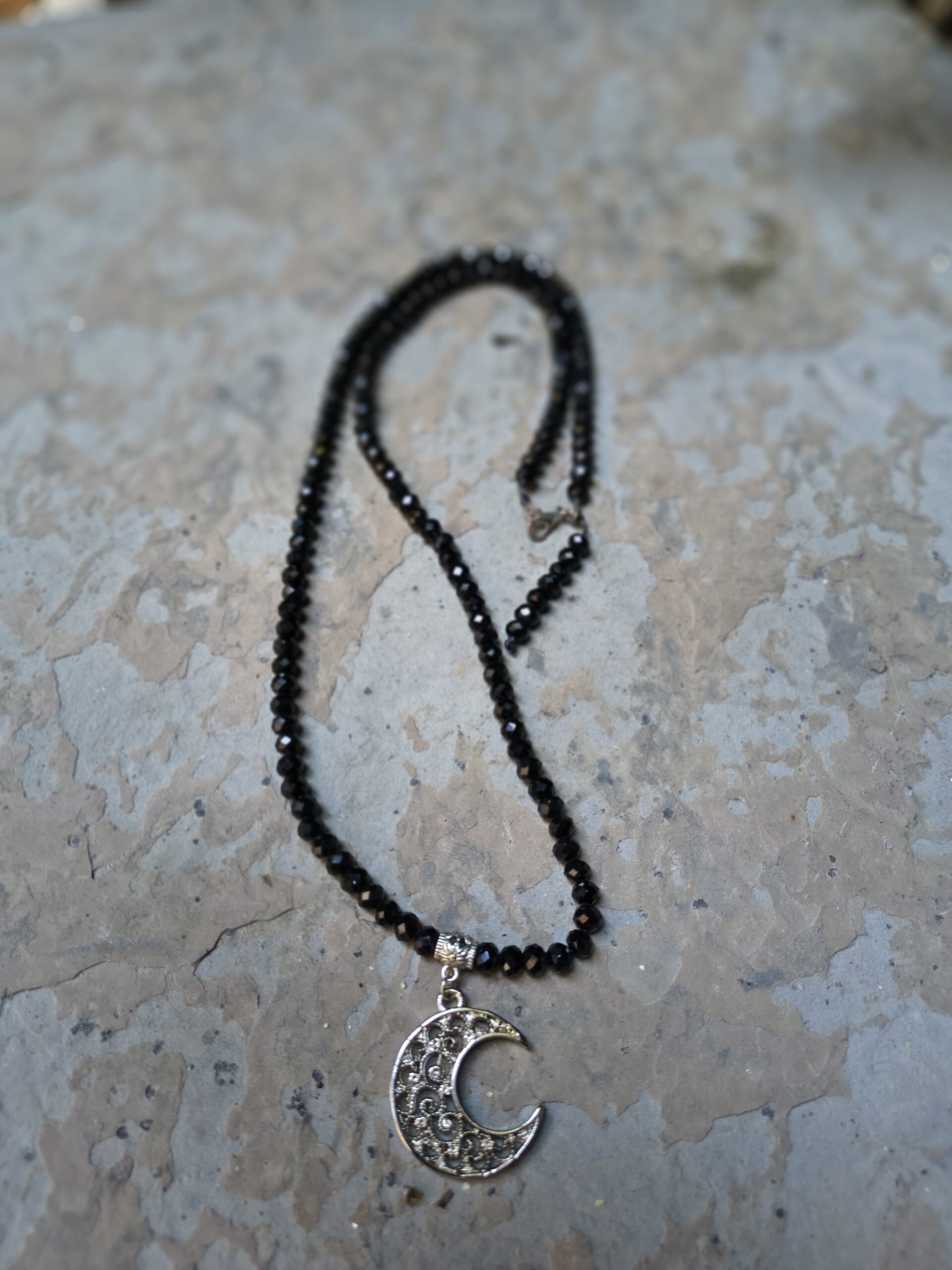 • Material: cristal preto lapidado e pingente metálico de Lua Crescente.