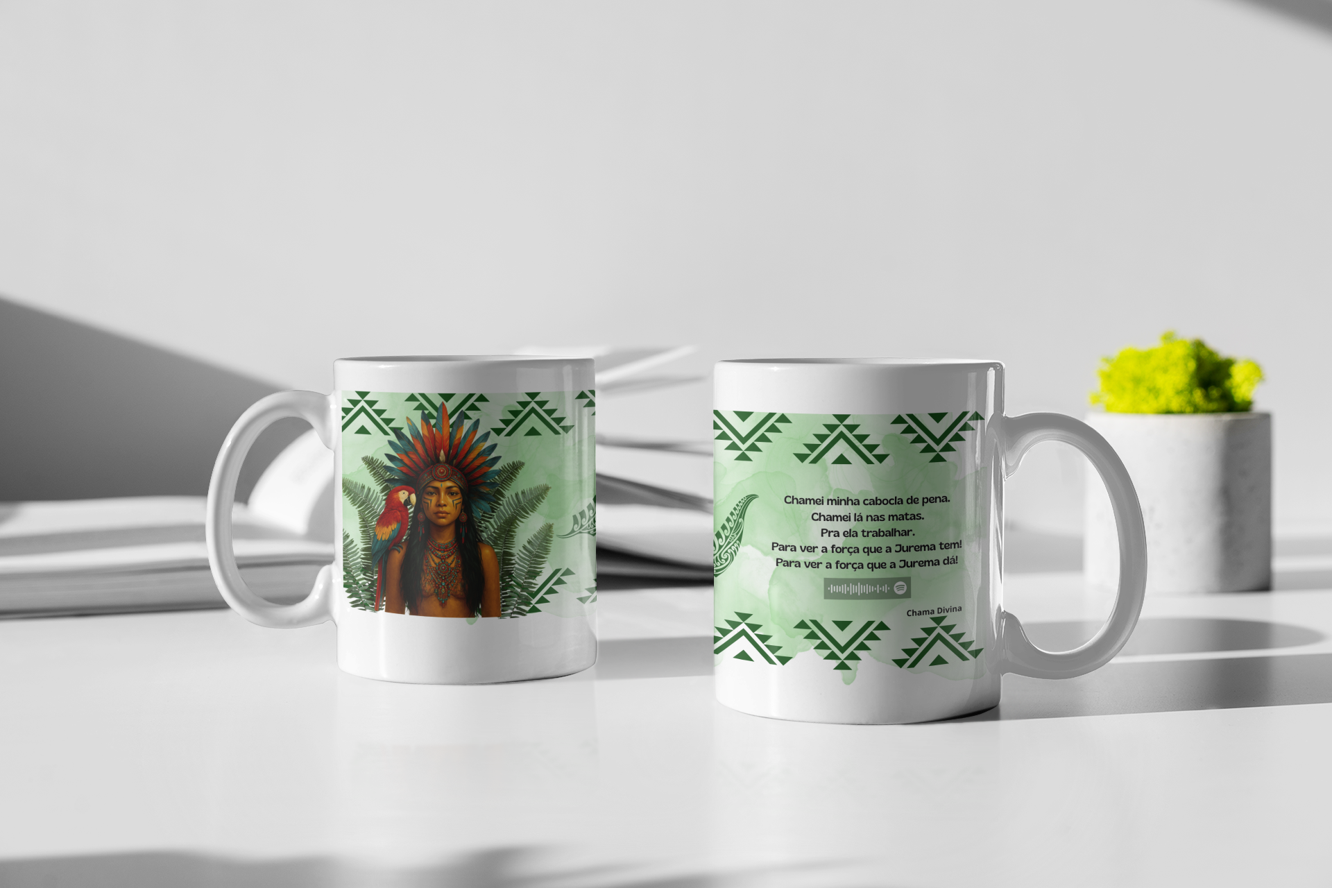 A Caneca Cabocla Jurema traz uma representação poderosa da entidade, adornada com seu cocar de penas e envolta pela energia viva da floresta.