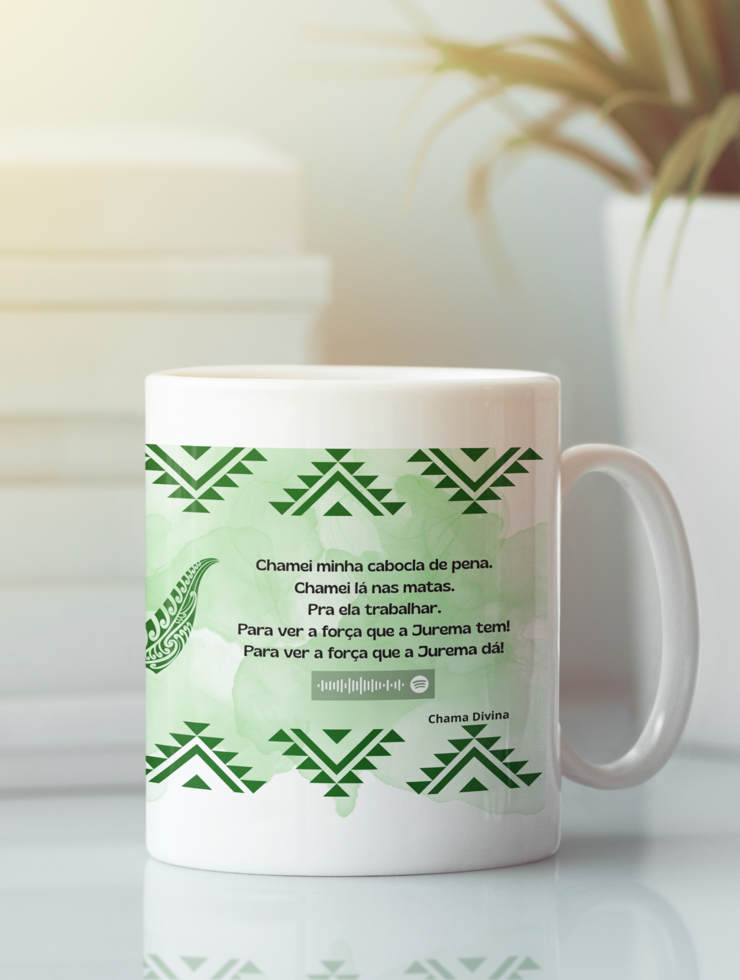 Esta caneca possui um QR Code exclusivo do aplicativo Spotify. Ao escanear, você será direcionado para uma música especialmente selecionada, conectada à vibração da Cabocla Jurema, fortalecendo sua sintonia espiritual, firmeza, proteção e trabalho de cura na força da mata.