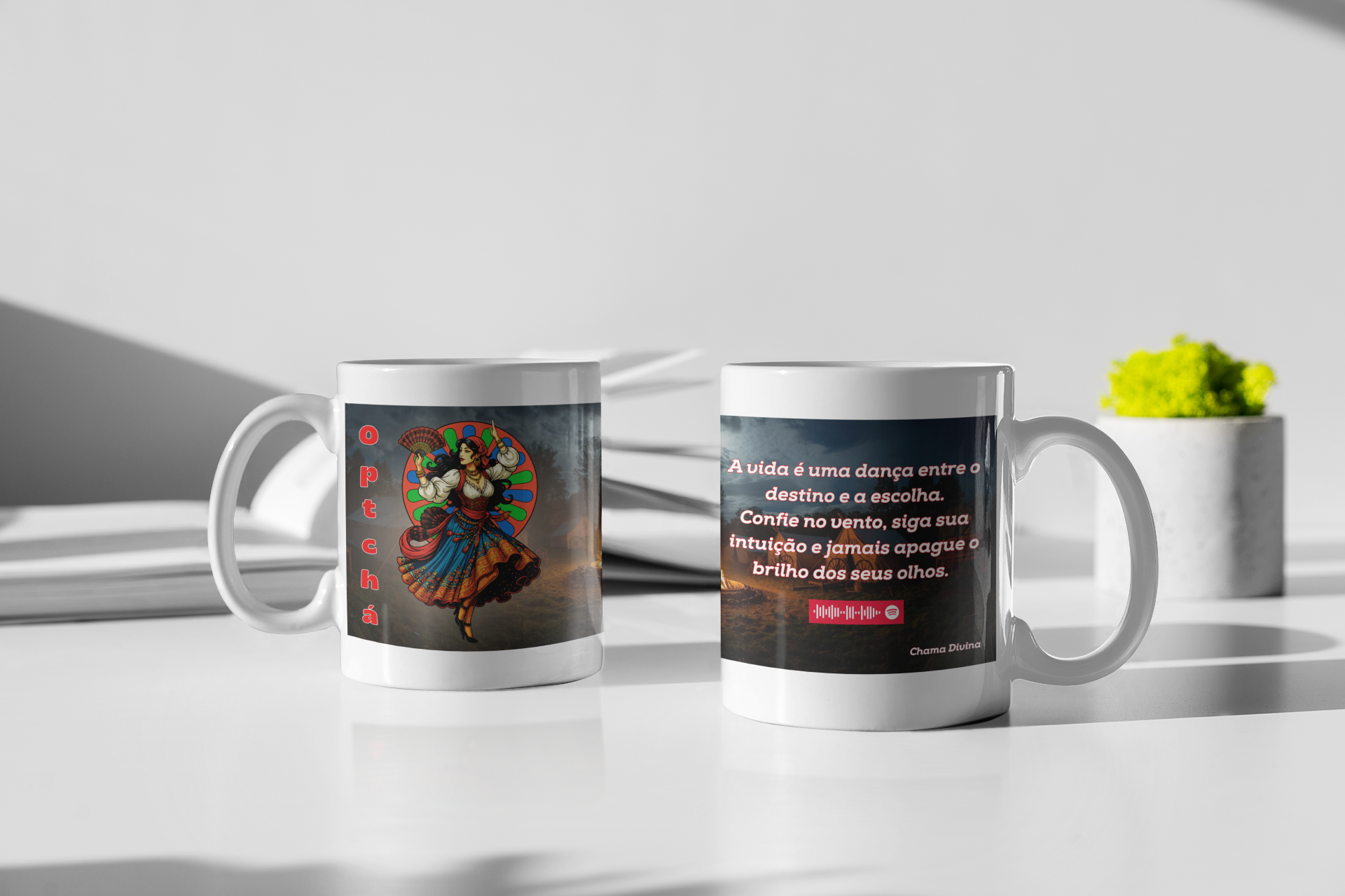 A Caneca Cigana apresenta a imagem vibrante de uma mulher cigana em dança, com suas cores vivas, suas saias em movimento e toda a energia mística que acompanha esse grande povo.