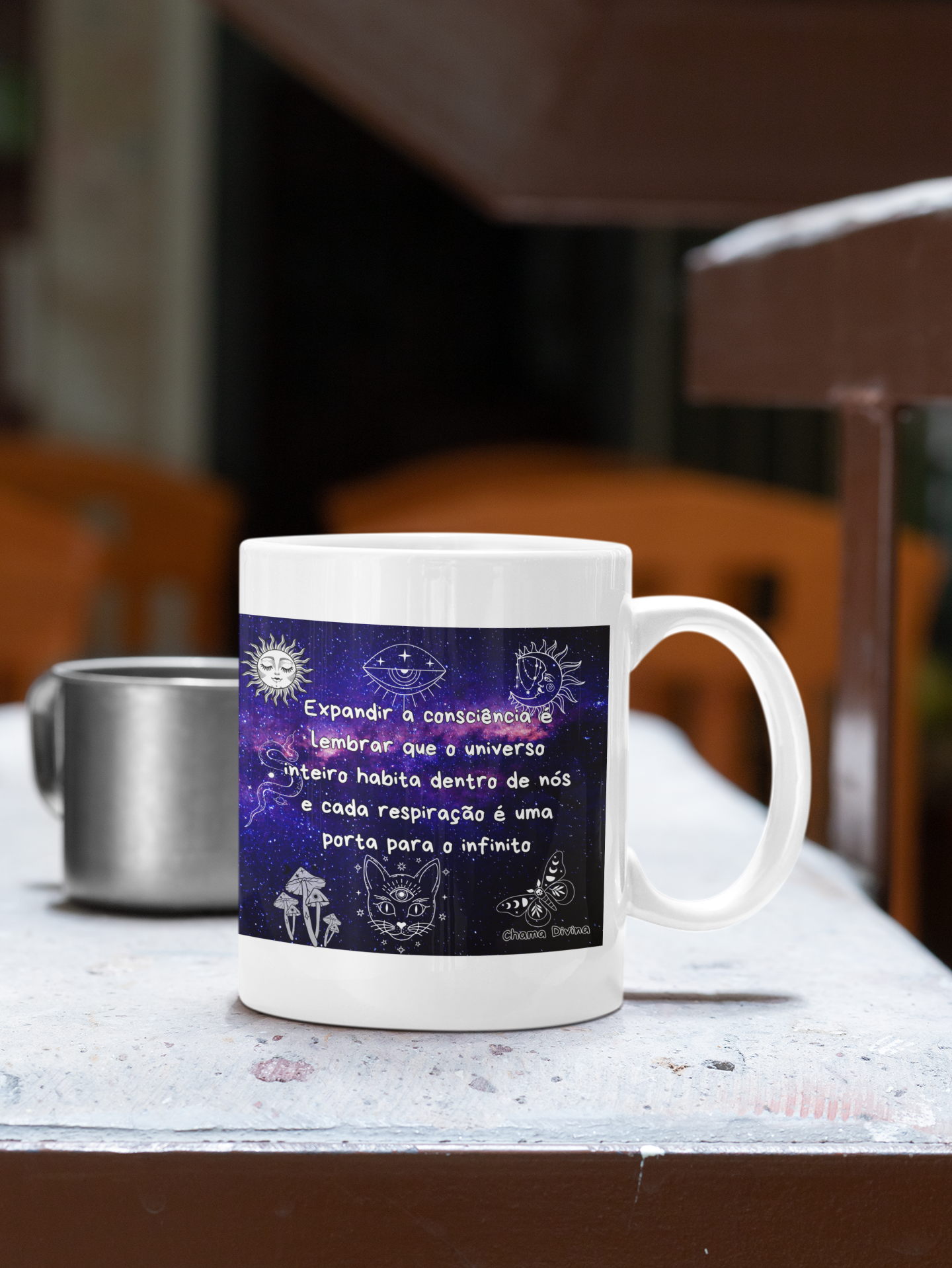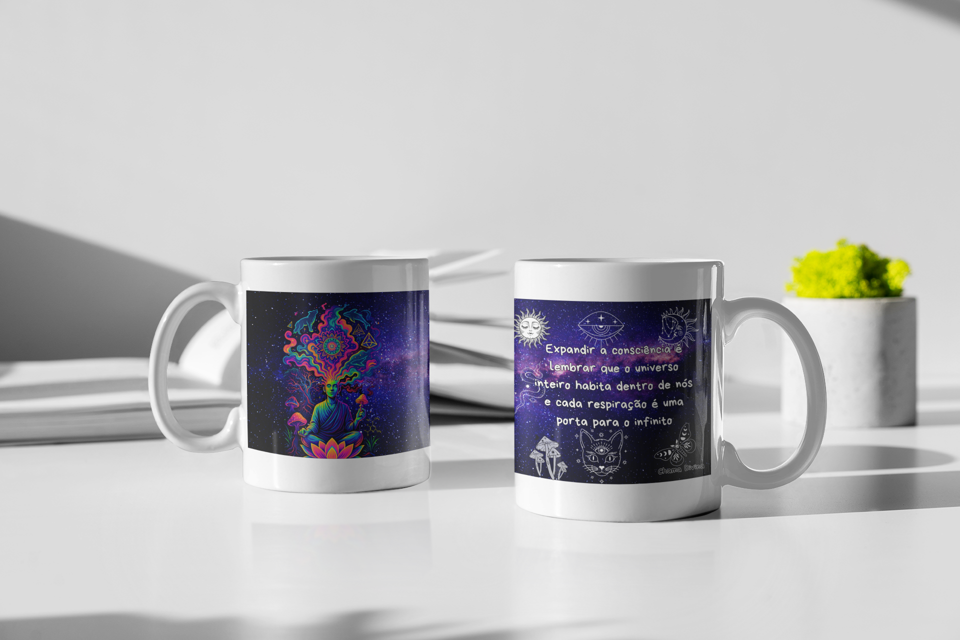 A Caneca Expansão da Consciência traz uma arte vibrante e psicodélica, com cogumelos místicos, símbolos de transformação e figuras meditativas que representam o estado de presença, abertura e transcendência.