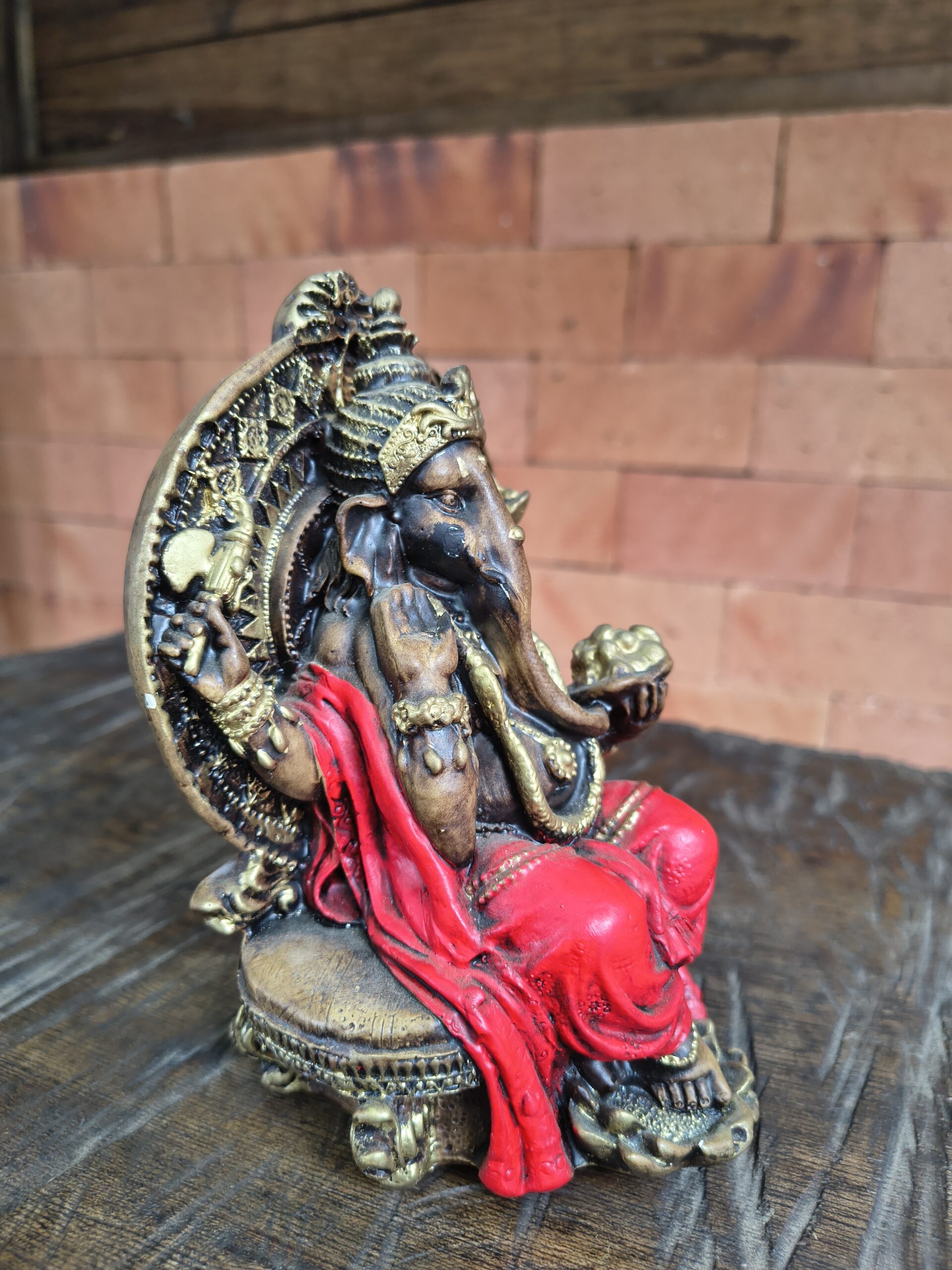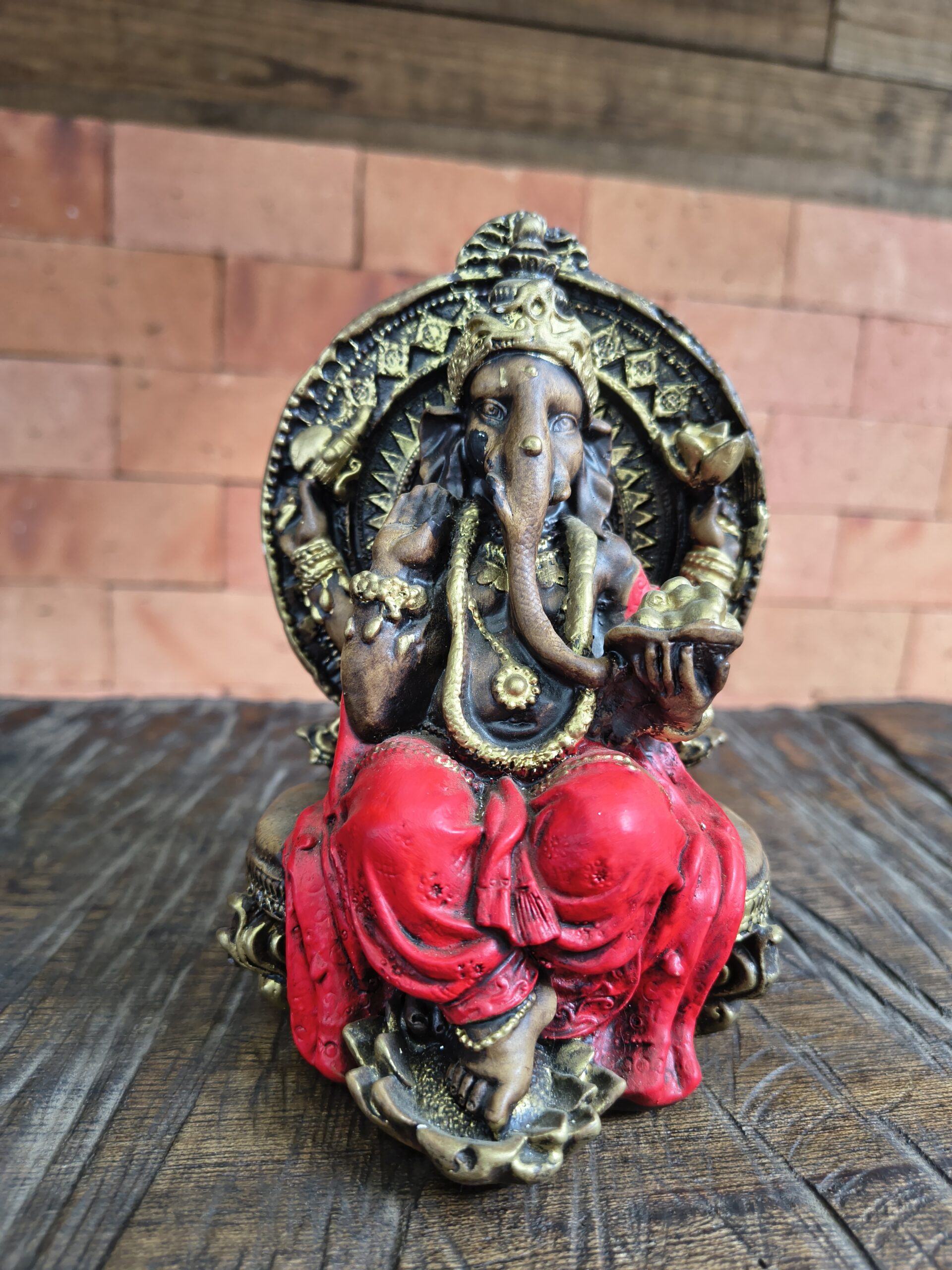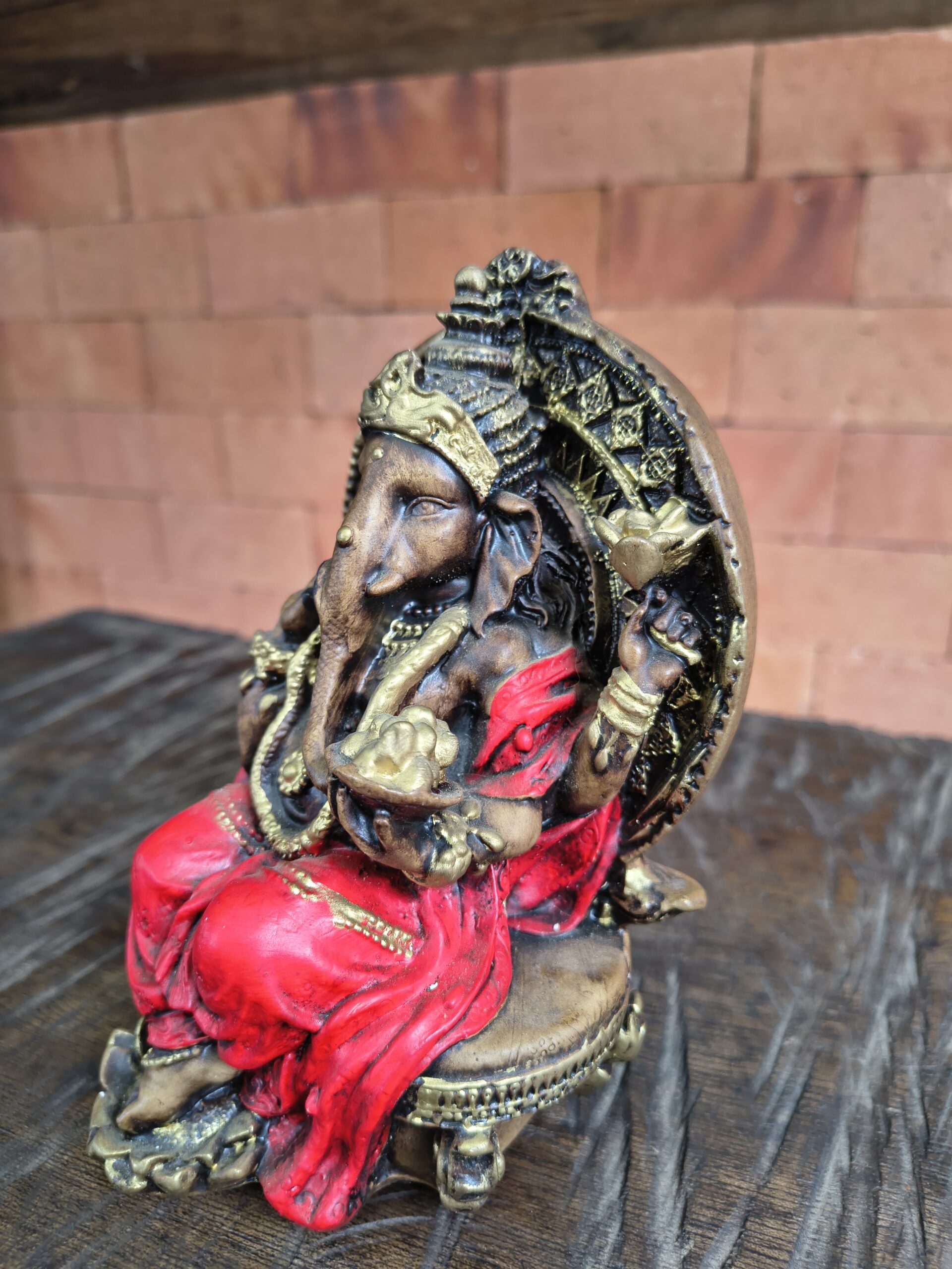 Esta belíssima imagem de Ganesha, uma das divindades mais amadas do hinduísmo, manifesta a energia da sabedoria, da prosperidade e da superação. Representado com detalhes finos em dourado e vestes vibrantes, Ganesha aparece sentado em postura serena, irradiando equilíbrio e abundância.