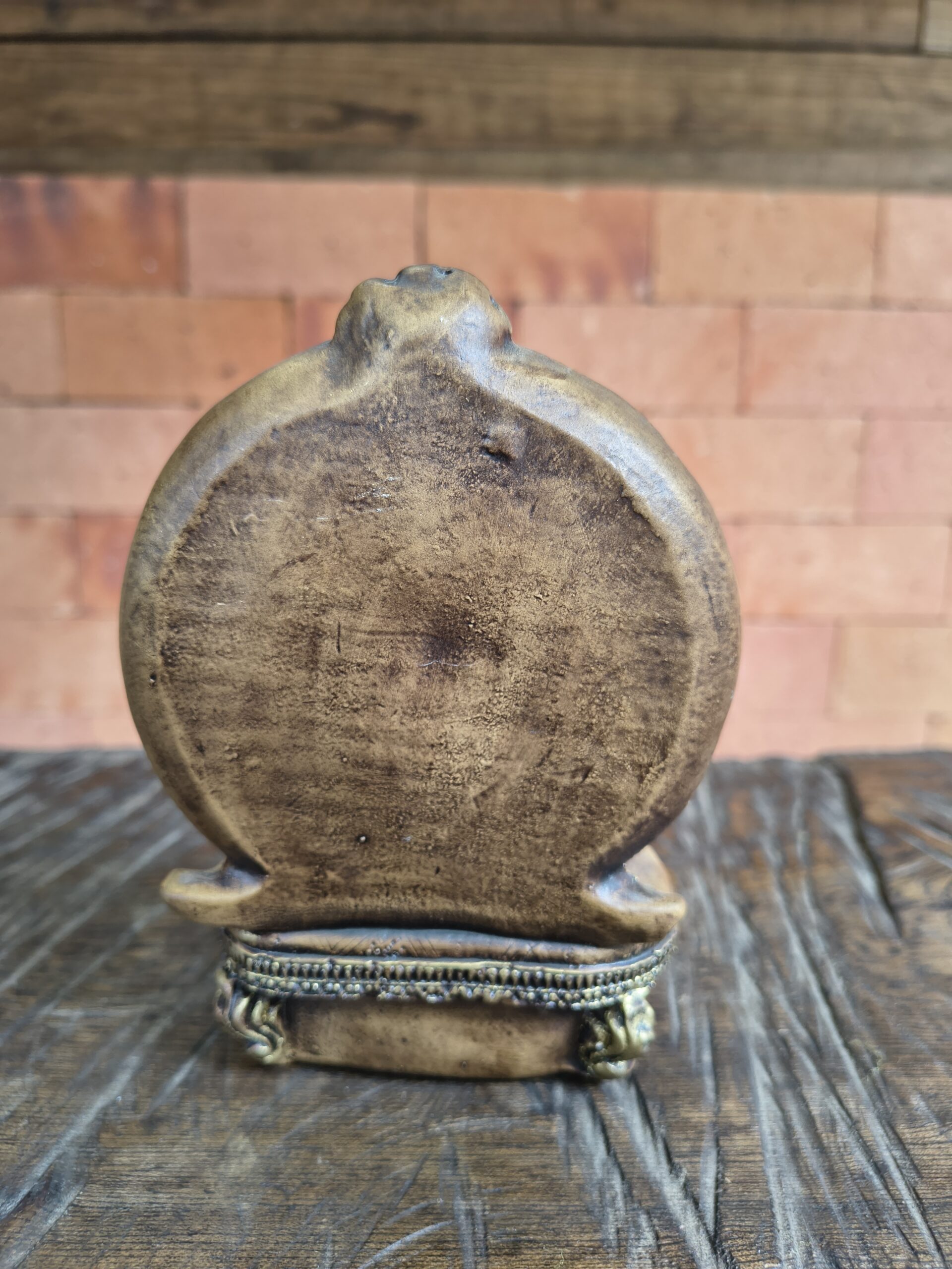 • Pintura detalhada em tons dourados, terrosos e vermelho profundo