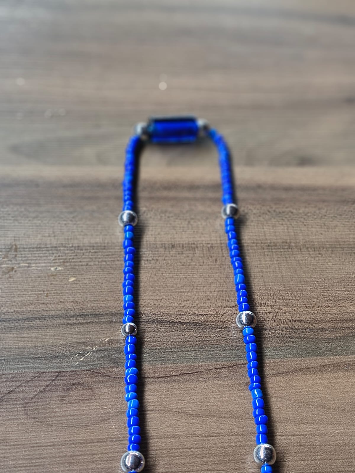 - Material: Contas em tom azul marinho com acabamento artesanal.