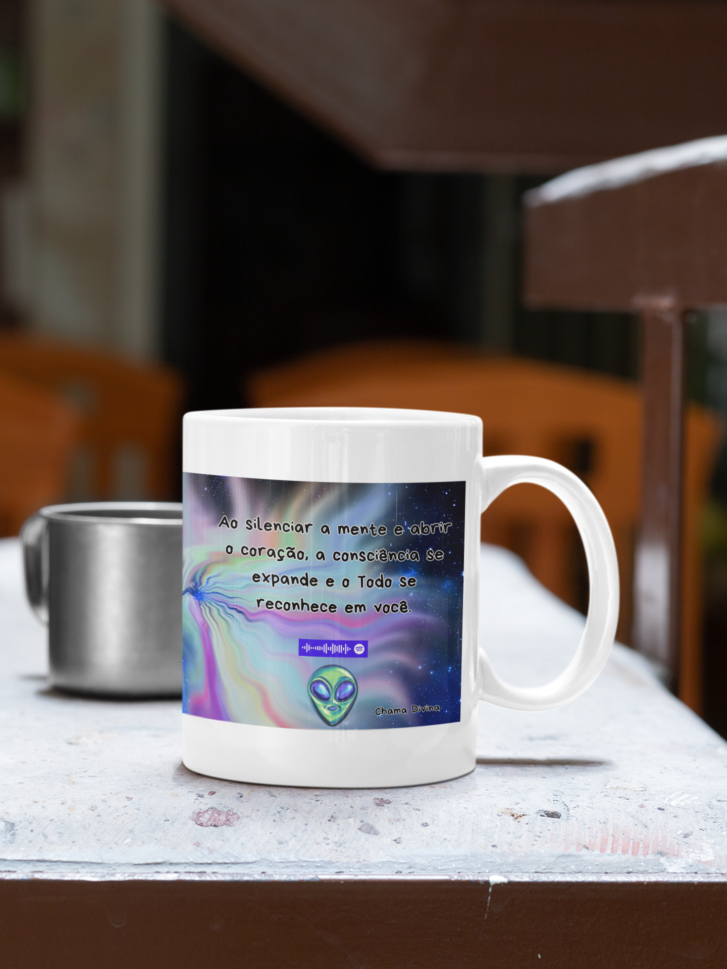 Esta caneca possui um QR Code exclusivo do aplicativo Spotify. Ao escanear, você será direcionado para uma música especialmente selecionada, criada para acompanhar práticas de meditação, introspecção, expansão da consciência e alinhamento energético, aprofundando sua experiência interior.