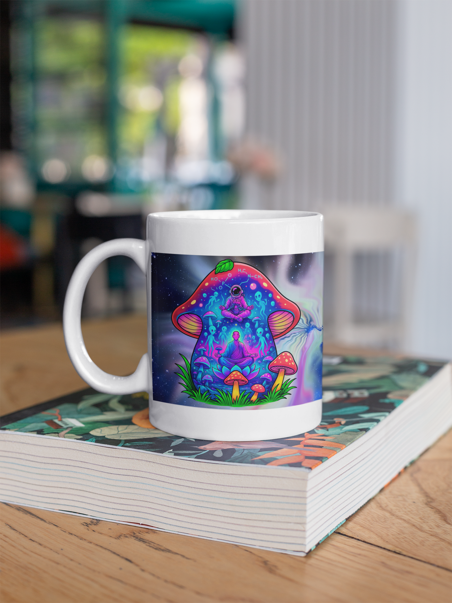 A Caneca Meditação & Expansão da Consciência traz uma arte vibrante que une psicodelia, espiritualidade e autoconhecimento.
