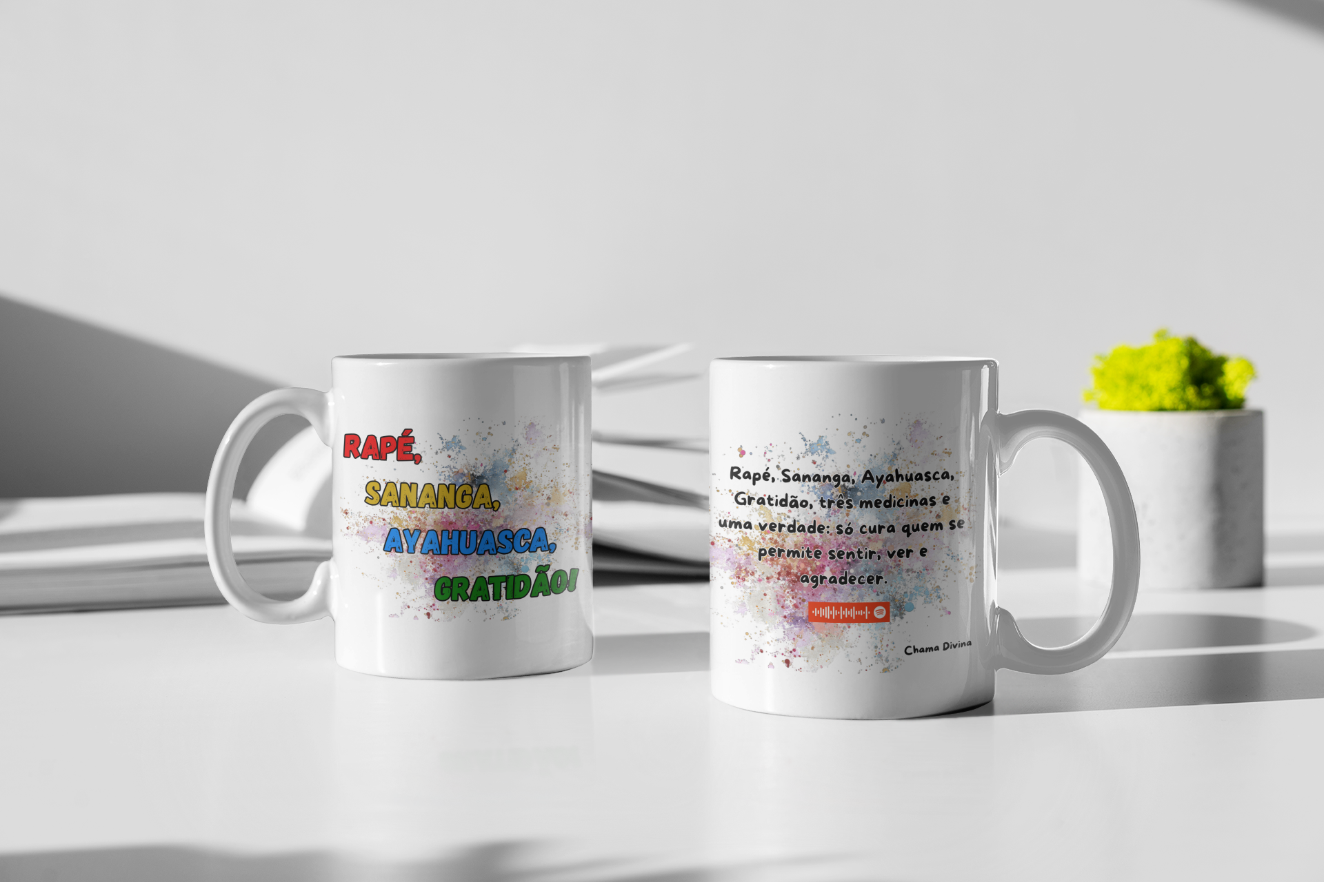 Esta caneca possui um QR Code exclusivo do aplicativo Spotify. Ao escanear, você será direcionado para uma música especialmente selecionada, pensada para acompanhar momentos de rezo, introspecção, integração e conexão com a energia das medicinas da floresta.