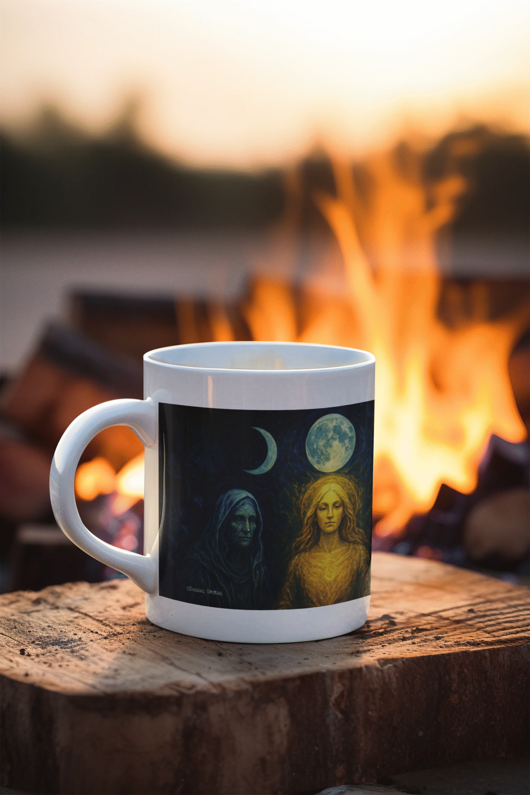 A Caneca Tríplice Deusa traz a representação ancestral da Donzela, da Mãe e da Anciã sob as fases da Lua — crescente, cheia e minguante.